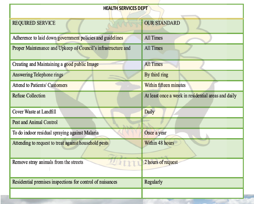 To achieve the highest safety, health and hygiene standards for all through the provision of value for money environmental interventions and primary health care services.